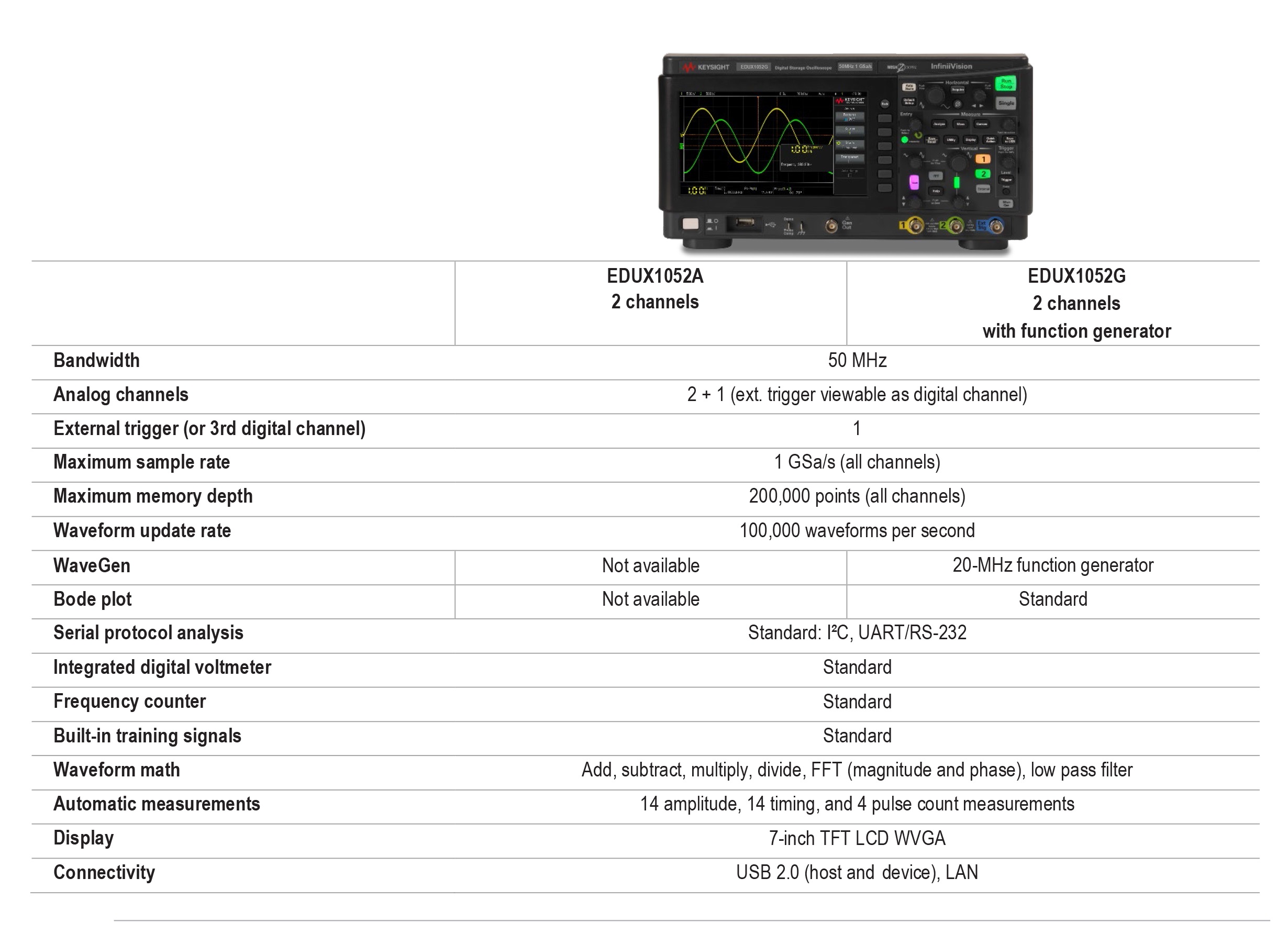EDUX1052A 오실로스코프는 2개의 아날로그 채널에서 50 MHz 대역폭을 제공합니다.
