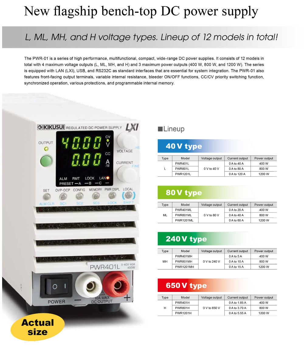 PWR-01 시리즈는 소형, 고성능, 다기능 컴팩트 와이드 레인 지 직류 전원입니다. 최대 출력 전압으로 4개 모델(L, ML, MH, H) 및 최대 출력 전력으로 3개 모델(400W, 800W, 1200W)의 총 12개 모델을 라인업하고 있습니다. 추가로 2KW (40V/ 200A)의 라인업이 새롭게 출시되었습니다. 아날로그 컨트롤뿐만 아니라 CPU 탑재로 시퀀스 설정도 가능 합니다. 또한 시스템 업에 필수적인 통신 인터페이스 LAN(LXI), USB, RS232C를 표준 탑재. 기타 전면 출력단자, 내부 저항 가변 기능, 블리더 ON/OFF 기능, CV/CC 우선 전환 기능, 동기운전 기능, 각종 보호 기능, 메모리 기능 등을 갖추고 있습니다.