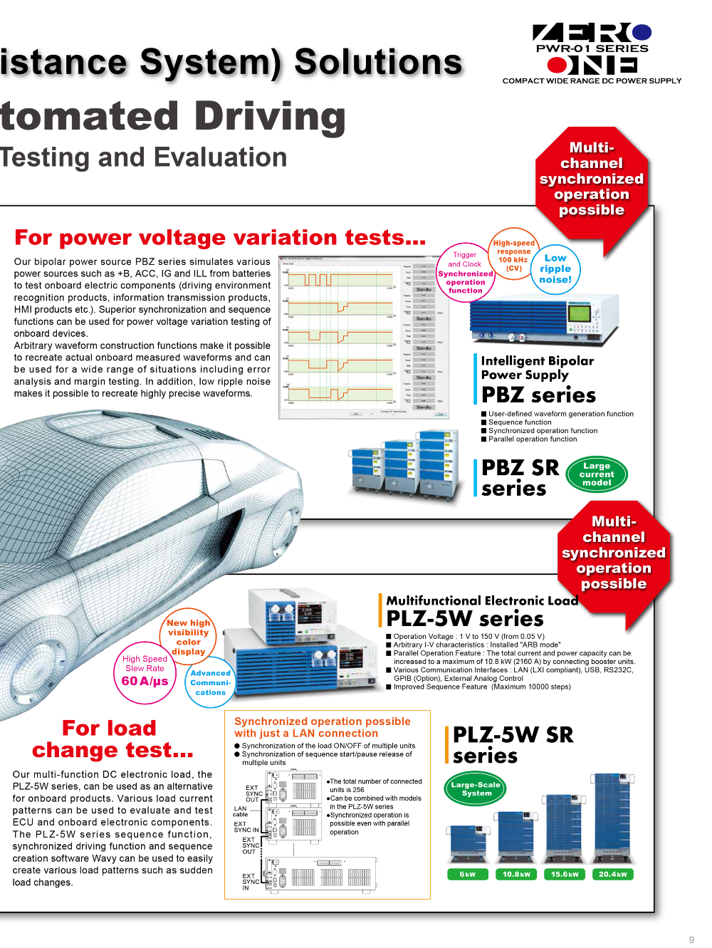 PWR-01 시리즈는 소형, 고성능, 다기능 컴팩트 와이드 레인 지 직류 전원입니다. 최대 출력 전압으로 4개 모델(L, ML, MH, H) 및 최대 출력 전력으로 3개 모델(400W, 800W, 1200W)의 총 12개 모델을 라인업하고 있습니다. 추가로 2KW (40V/ 200A)의 라인업이 새롭게 출시되었습니다. 아날로그 컨트롤뿐만 아니라 CPU 탑재로 시퀀스 설정도 가능 합니다. 또한 시스템 업에 필수적인 통신 인터페이스 LAN(LXI), USB, RS232C를 표준 탑재. 기타 전면 출력단자, 내부 저항 가변 기능, 블리더 ON/OFF 기능, CV/CC 우선 전환 기능, 동기운전 기능, 각종 보호 기능, 메모리 기능 등을 갖추고 있습니다.