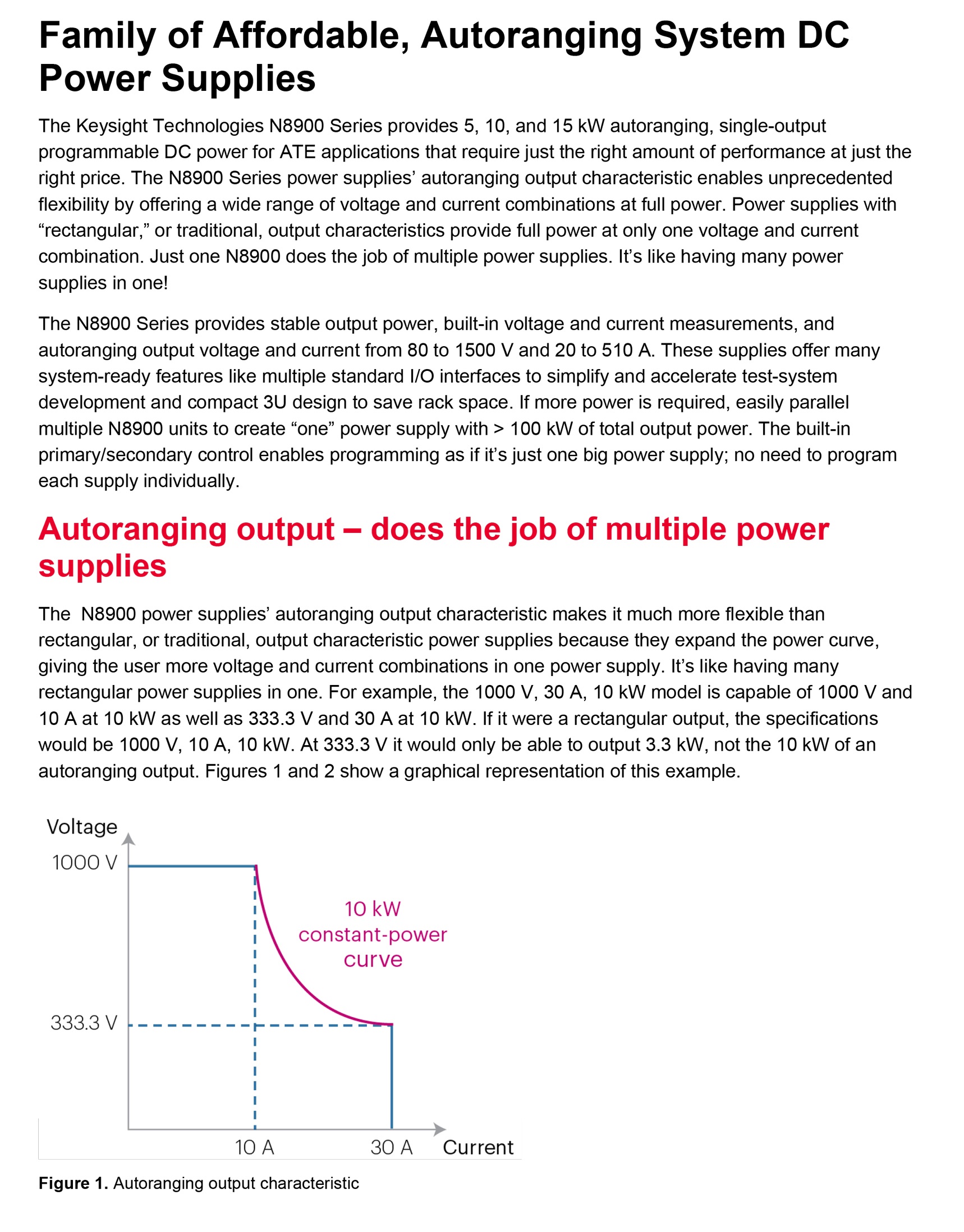 키사이트 N8900 시리즈는 적당한 가격에 적당한 성능을 필요로 하는 ATE 어플리케이션에 5kW, 10kW, 15kW 자동 범위 조정, 단일 출력 프로그래밍 가능한 DC 전력을 제공합니다. N8900 시리즈 전원 공급기의 자동 범위 조정 출력 특성은 최대 전력에서 광범위한 전압 및 전류 조합을 제공하여 최고의 유연성을 구현합니다. 기존의 “직사각형” 전원 공급기 출력 특성은 단 하나의 전압 및 전류 조합에서 최대 전력을 제공합니다. 단 하나의 N8900이 여러 전원 공급기의 역할을 합니다. 이는 마치 여러 전원 공급기를 하나의 장치에 담은 것 같습니다!