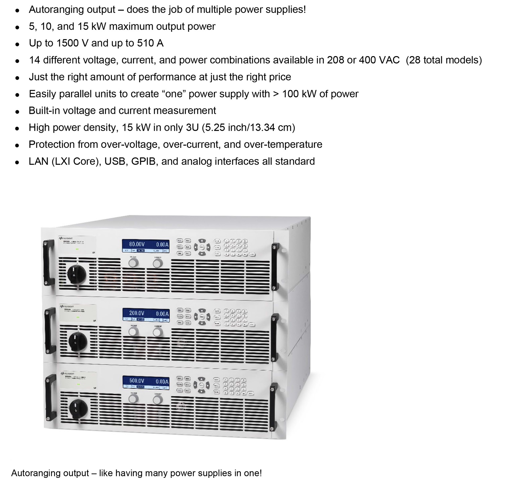N8923A 자동 범위 조정 시스템 DC 전원 공급기, 500V, 30A, 5000W, 208VAC
