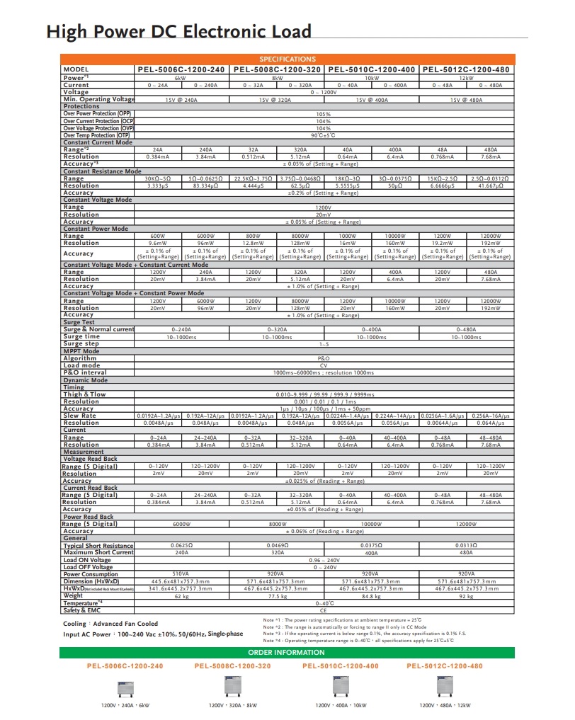 GW Instek PEL-5000C 시리즈 단일 채널 전자 부하는 6kW~24kW의 전력 범위를 가진 150V/ 600V/ 1200V 모델을 제공합니다. PEL-5000C는 전력, 전압 및 전류의 다양한 조합을 특징으로 하는 총 24개의 모델을 보유하고 있습니다. 배터리, 전기 자동차 충전기/충전소, 전기 자동차 배터리 및 태양광 패널의 사양을 테스트하고 검증할 수 있습니다. PEL-5000C는 동일한 전압 사양 및 다른 전력 모델에 대한 병렬 연결을 지원합니다. PEL-5000C는 최대 8개의 장치를 병렬로 연결하여 최대 192kW의 전력을 제공할 수 있습니다.