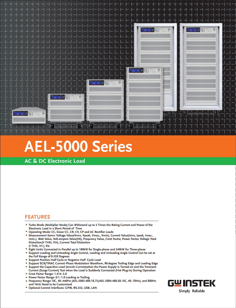 GW Instek은 전력 범위에 따라 AEL-5000 시리즈 AC/DC 전자 부하 20개 모델을 출시합니다. 단일 장치의 전력 범위는 1875W에서 22500W이며 최대 8개 장치를 병렬로 연결할 수 있습니다. 단상 병렬 연결의 최대 전력은 180kW에 도달할 수 있으며 3상의 총 전력은 540kW에 도달할 수 있으며 UPS, 인버터/차단기, AC 전원, 배터리, 퓨즈/차단기, DC 전원 및 기타 애플리케이션에 적합합니다.