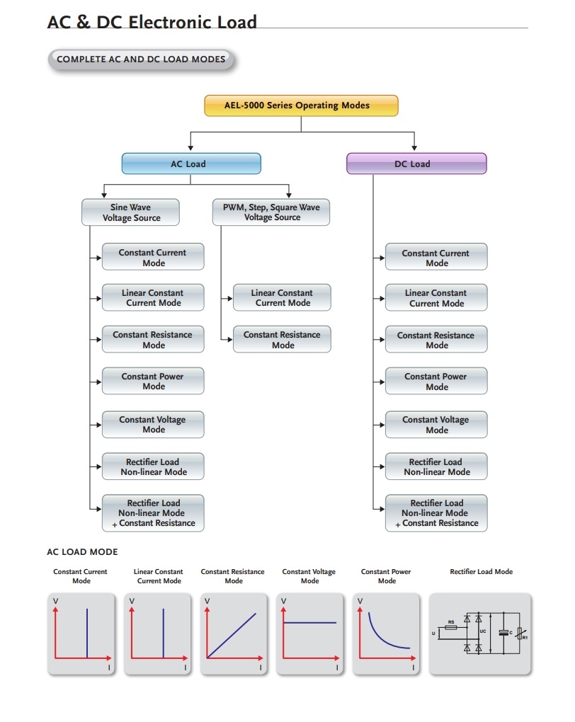 * CC, 선형 CC, CR, CV, CP 및 AC 정류기 부하 모드