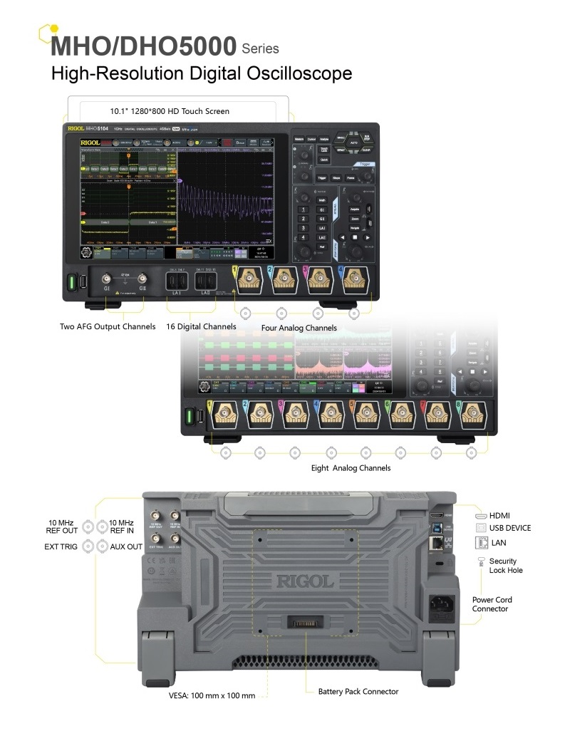 DHO/MHO5000 시리즈는 다양한 애플리케이션의 설계, 디버깅 및 테스트 요구 사항을 충족하기 위해 개발된 고해상도 디지털 오실로스코프 제품군입니다. 1,000,000wfms/s 파형 캡처 속도(고속 녹음 모드), 500Mpts 메모리 깊이, 12비트 해상도 및 뛰어난 노이즈 플로어는 까다로운 측정 시나리오의 고정밀 요구 사항을 충족할 준비가 되어 있습니다. DHO/MHO5000 시리즈 디지털 오실로스코프에는 임의 기능 생성, 디지털 신호 분석, 보드 플롯 분석 및 기타 기능을 지원하는 구성을 포함하는 여러 모델이 있습니다.