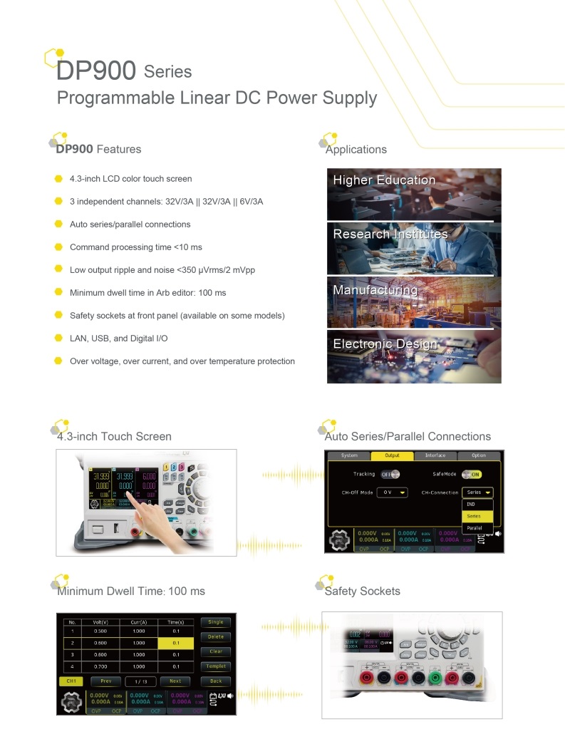 DP900 시리즈 전원 공급 장치는 벤치탑 DC 전력 분석을 위해 설계된 새로운 유연성 및 고속 기능과 새로운 터치 스크린 인터페이스를 결합합니다. DP932A 및 DP932U는 3채널 완전 절연 벤치탑 전원 공급 장치입니다. 초당 최대 10회까지 전원 공급 장치 출력을 업데이트할 수 있는 고속 arb 기능을 활성화하면서 전면 패널에서 반복되는 모양이나 패턴을 빠르게 생성할 수 있습니다. 또한 채널 1과 2를 내부적으로 병렬 또는 직렬로 결합하여 테스트를 위한 전력 엔벨로프를 확장할 수 있습니다. 이제 하나의 케이블 연결로 두 채널의 전류 또는 전압을 얻을 수 있으므로 더 이상 케이블 연결 문제가 없습니다. DP932A는 모든 기능을 사용할 수 있는 상태로 제공됩니다. DP932U에는 선택적 해상도, 디지털 IO 및 임의 속도 업그레이드가 있습니다. DP932U에는 DP932A의 바인딩 포스트 대신 안전 바나나 플러그도 함께 제공됩니다. 이러한 유연성과 기능의 조합으로 인해 DP900은 모든 엔지니어의 작업대에 중요한 추가 요소가 되었습니다.