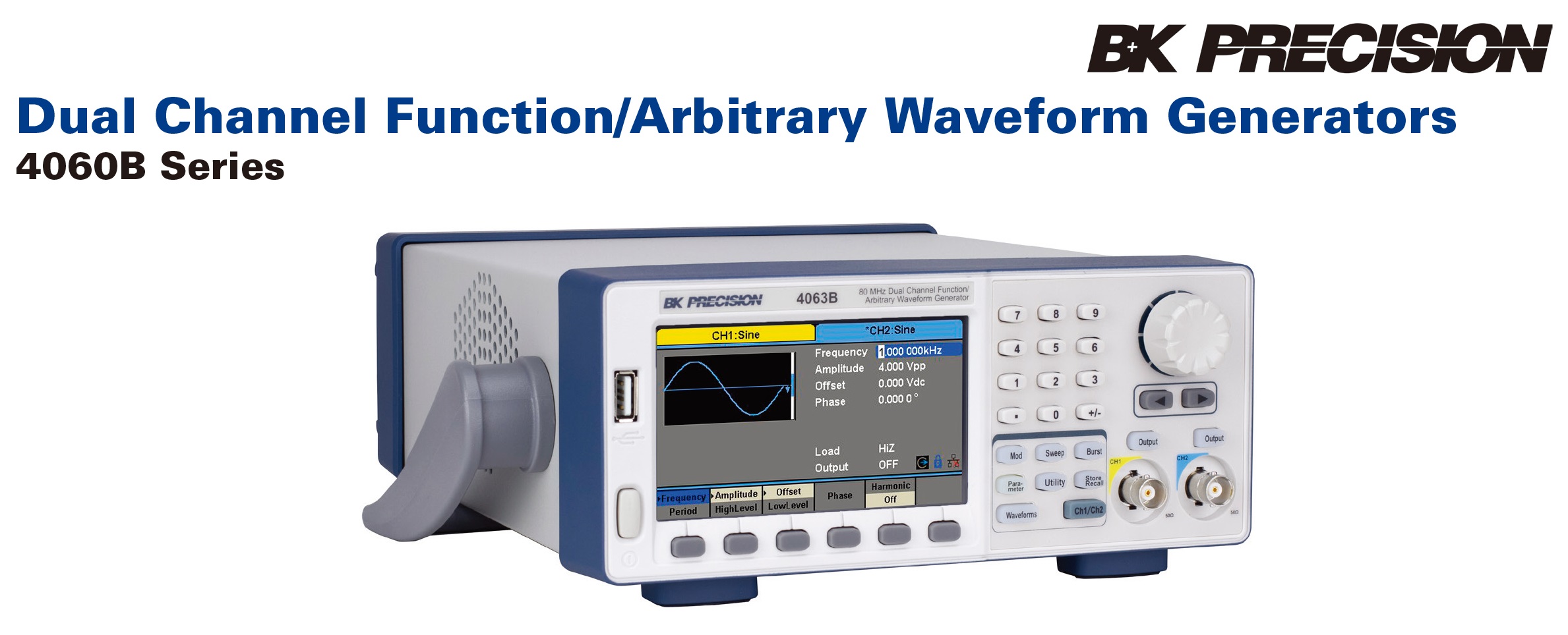 The 4060B Series Dual Channel Function/Arbitrary Waveform Generators are capable of generating stable and precise sine, square, triangle, pulse, and arbitrary waveforms. This series combines the cost saving benefits of DDS and true point-by-point arbitrary architectures to meet a wide range of applications that require high signal fidelity and low jitter arbitrary waveforms. With an easy-to-read color display and intuitive user interface with numeric keypad, these instruments offer plenty of features including linear/logarithmic sweep, burst mode, and variable DC offset. Generate custom arbitrary waveforms using the included application software, or select from the 196 built-in arbitrary waveforms.