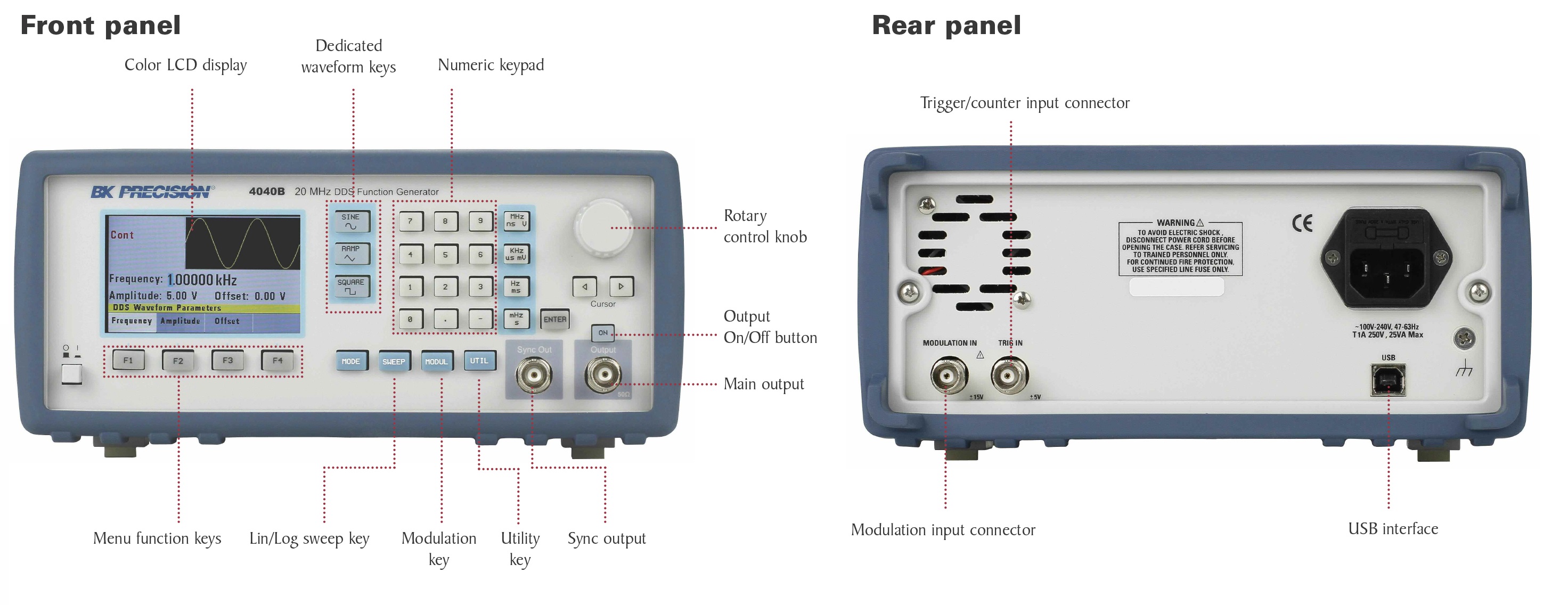Models 4014B and 4040B are versatile sweep function generators, designed with a dual technology architecture combining direct digital synthesis (DDS) and a low-jitter square wave generator. These instruments generate sine, square, and triangle waveforms with high signal precision and stability. Both models provide variable output voltages from 0 to 10 Vpp into 50 ohms (up to 20 Vpp into open circuit), linear and logarithmic sweep, AM/FM modulation, and a continuously variable DC offset to inject signals directly into circuits at the correct bias level.